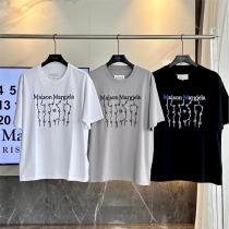 Maison Margiela Tシャツは、ホワイト、グレー、ブラックの3色展開で、特徴的なグラフィックデザインが施されています。中央にはロゴが、流れるような線で構成されたアート的なフォントで表現され、視覚的に印象的です。ラインがデザインとして重なり合うことで、ユニークな動きとエネルギーを感じさせます。メゾン マルジェラ Tシャツ